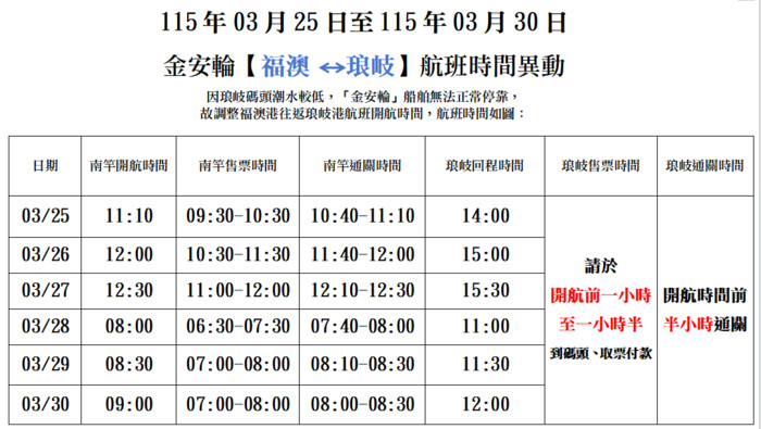 3/25-3/30【金安輪】琅岐航班異動