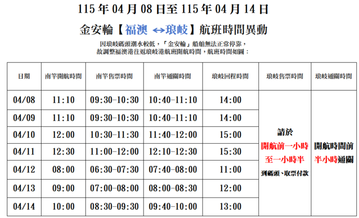 4/8-4/14【金安輪】琅岐航班異動
