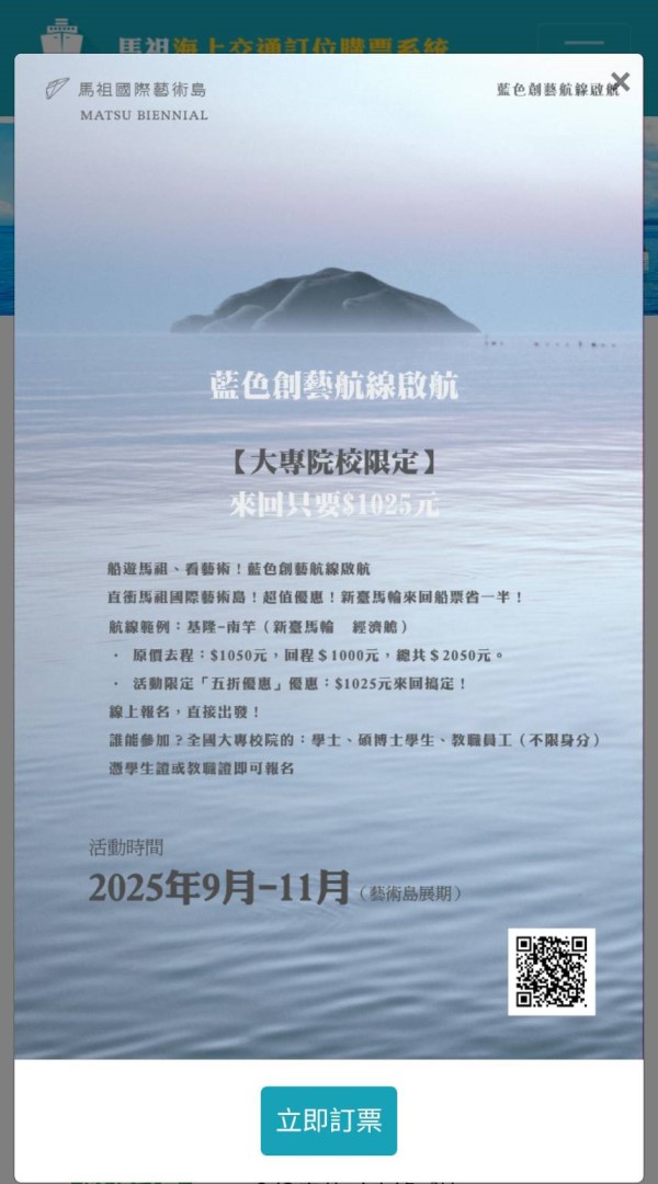 但由於藝術島大專院校優惠票的頁面佔領全部版面,部分民眾操作手機時都不會細看,直覺反應按「立即訂票」,導致誤認馬祖海上訂位系統又故障了。希望交旅局不要為了少數藝術島優惠訂位需求,而將廣告蓋版,干擾系統的正常運作。