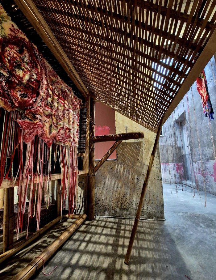 《白馬非馬:女性的名與實》 竹轎是「紅轎」與「神轎」的意象。停放在梅石軍官特約茶室19號房門口。 房內牆面投影動畫(魚藍觀音傳說),一尾紅魚悠游於光影之間,那是白馬夫人的化身。...由楊真發佈於 2025年11月12日 星期三