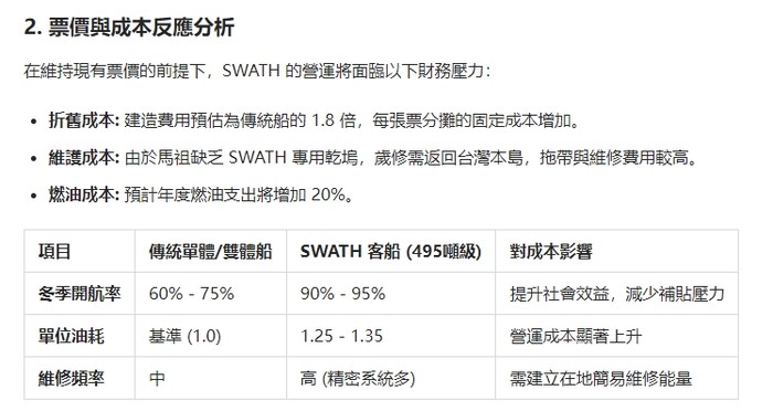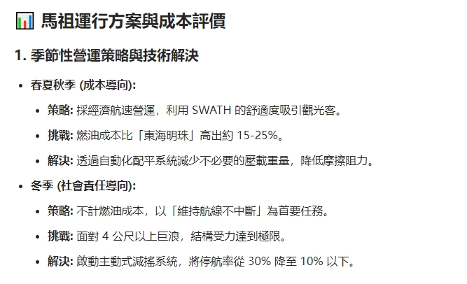 最終建議: 若要維持原有票價,政府需建立長期的「高穩定航線專案補貼」,或透過夏季觀光旺季的溢價服務(如 VIP 艙位)來交叉補貼冬季的虧損。SWATH 是馬祖海運的「最優技術解」,但需輔以「非典型財務規劃」方能長久運行。
