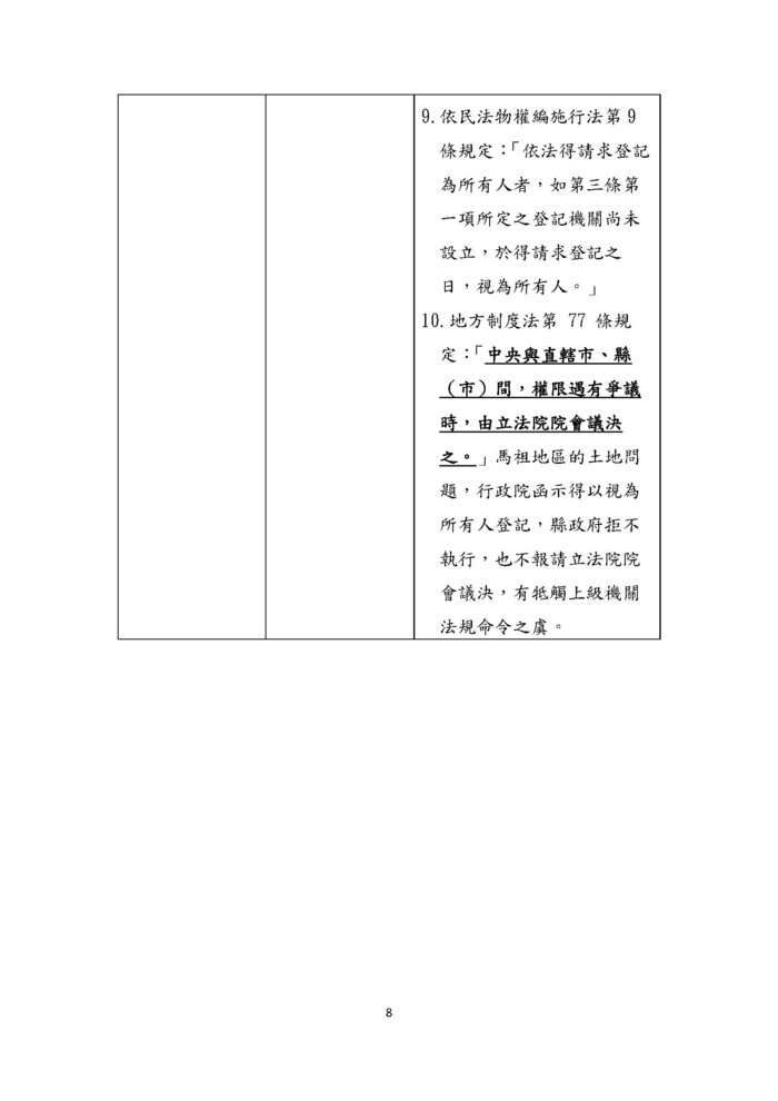 馬祖地區的土地行政院函示得以視為所有人登記,縣政府拒不執行,也不報請立法院院會議決,就擅自駁回人民申請登記案件,讓大家來評評理,你說有沒有行政怠惰。