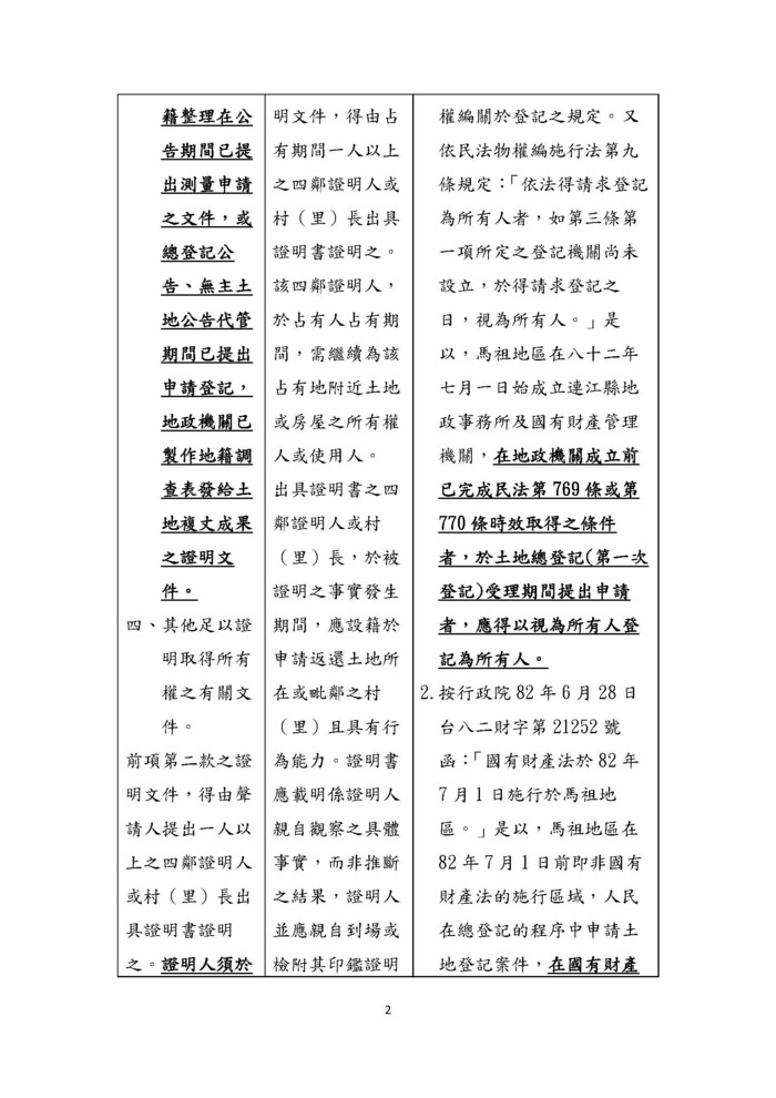 內政部81年2月22日台(內)字第06932號函核定「馬祖地區地籍航測計畫」,自82年7月1日起實施地籍整理,依序辦理地籍調查測量及土地登記。連江縣政府始於82年7月1日設立地政機關執行土地登記事務。依民法物權編施行法第三條規定:「(第1項)民法物權編所規定之登記,另以法律定之。(第2項)物權於未能依前項法律登記前,不適用民法物權編關於登記之規定。」是以,馬祖地區在82年7月1日前倘未設立地政機關就全縣所有土地辦理地籍調查及測量,其物權未能依法律規定登記,且未依法公告土地總登記(第一次登記),應不適用民法物權編關於登記之規定。又依民法物權編施行法第九條規定:「依法得請求登記為所有人者,如第三條第一項所定之登記機關尚未設立,於得請求登記之日,視為所有人。」因此,馬祖地區在八十二年七月一日始成立連江縣地政事務所,在地政機關成立前已完成民法第769條或第770條時效取得之條件者,於土地總登記(第一次登記)受理期間提出申請者,得以視為所有人登記為所有人。