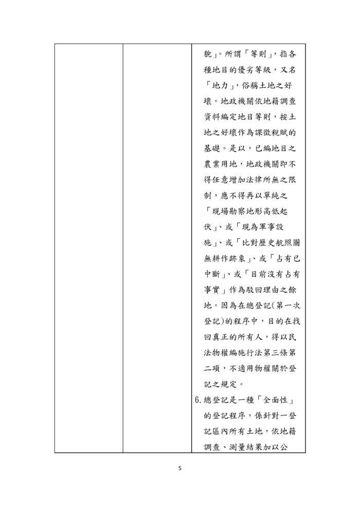 地政機關辦理地籍調查測量經依台灣省政府民政廳36年7月29日頒布之「台灣省土地地目明細表」,編定為建、雜、田、旱、林、墓等地目之土地,即為建築用地或直接生產用地,地政機關不應再以莫須有的理由駁回。所謂「地目」,指土地使用現況的類別,又名「地貌」。所謂「等則」,指各種地目的優劣等級,又名「地力」,俗稱土地之好壞。地政機關依地籍調查資料編定地目等則,按土地之好壞作為課徵稅賦的基礎。是以,已編地目之農業用地,地政機關即不得任意增加法律所無之限制,應不得再以單純之「現場勘察地形高低起伏」、或「現為軍事設施」、或「比對歷史航照圖無耕作跡象」、或「占有已中斷」、或「目前沒有占有事實」作為駁回理由之餘地。因為在總登記(第一次登記)的程序中,目的在找回真正的所有人,得以民法物權編施行法第三條第二項,不適用物權關於登記之規定。