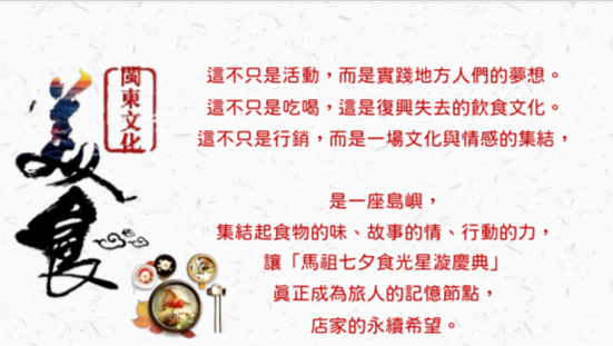何謂北竿酒祭 --閱讀人次 : 1446 在馬祖,除了那壯闊的戰地風光、悠遠的宗教信仰與獨特的閩東建築,我們相信,閩東飲食文化才是真正能打動人心的靈魂。這片土地上的味道,是我們的故事,是我們的夢想,也是我們想要用心傳遞給每一個來到這裡的旅人。