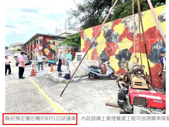 縣府希望塘后橋能在8月1日進行試通車,施工廠商正全力趕工。游源順表示,橋梁工程首重安全,過程也務必注意工安,工程細節部分希望廠商有所改善「既然做了就要做好」。