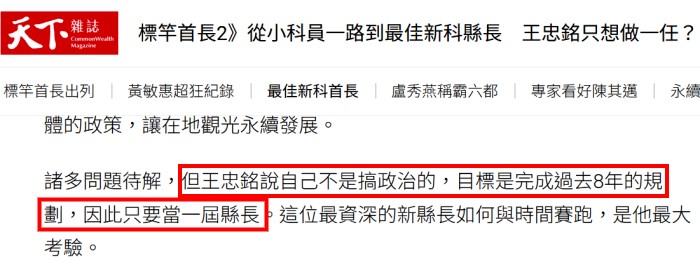 大坵橋就像一面照妖鏡,照出政治人物是否有真本事、是否誠實。大坵橋的工期是三年半,在劉增應縣長任用發包,預定在他卸任之前通車,結果是怎樣大家都知道了。好了,一位自稱CEO縣長,只做一任能完成劉增應八年的規畫,於是就職三年了,大坵橋還是遙遙無期。明年這時候縣長又要換屆選舉了,大坵橋並不會在王忠銘四年任內完成,他的承諾跳票了,還好意思說再給我四年嗎?