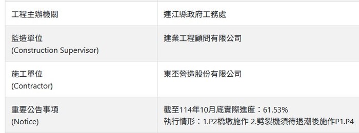 另外,大坵橋今年2月底的進度是59.67%,經過今年整個夏天的施工,進度不到2%,現在大家不必期待它的完工日期,而是要擔心會不會成為爛尾橋了。