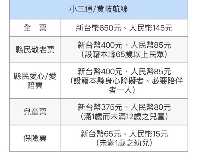 而馬祖黃岐小三通敬老票只針對縣籍65歲以上的縣民(NT$400元)