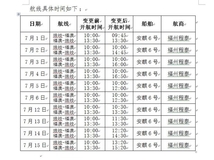 因琅岐港潮位問題,以致現行航班無法靠泊,遂經商議,更正航班時間如下,請欲搭乘旅客多加留意航班資訊,造成不便敬請見諒!