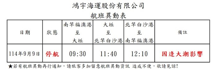 9/9【鴻宇海運】南竿-大坵-北竿-南竿【航班異動公告】