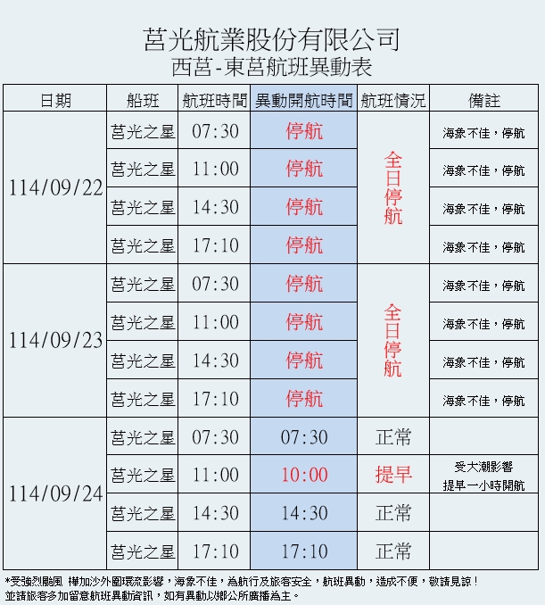 9/22-9/24【莒光之星】西東莒航班-異動更新 --閱讀人次 : 1348 114年9月22日至9月24日本公司所属【莒光之星】客船,