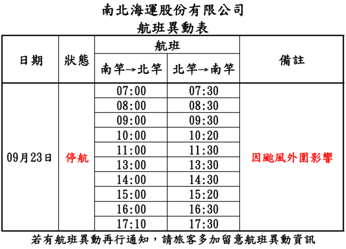 09/23【南北海運】-南北竿航線 停航 --閱讀人次 : 797 本公司經營南竿往返北竿航線,因受颱風外圍環流影響,海象不佳