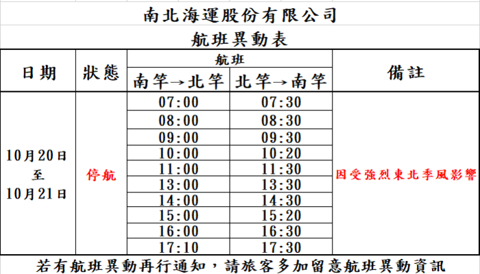 為旅客及航行安全,114年10月20日至10月21日航班異動如下,造成不便,敬請見諒!謝謝