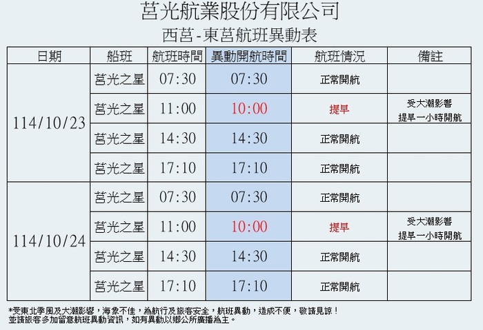 10/23-10/24【莒光之星】西東莒航班異動-更新 --閱讀人次 : 1807 114年10月23日及10月24日本公司所属【莒光之星】客船,