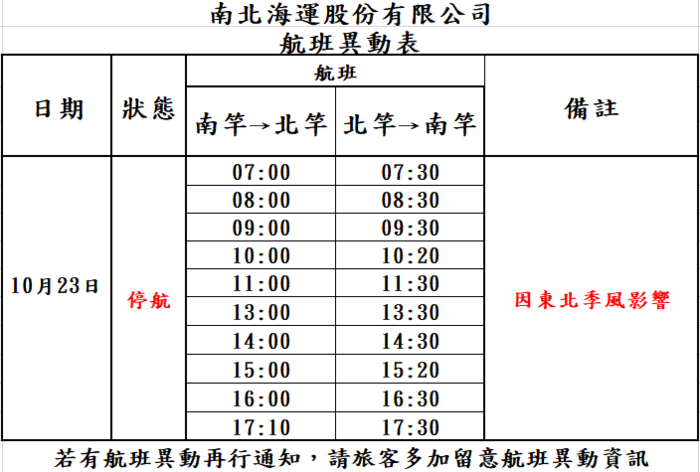 10/23【南北海運】-南北竿航線 停航 --閱讀人次 : 963 本公司經營南竿往返北竿航線,因受強烈東北季風影響,海象不佳