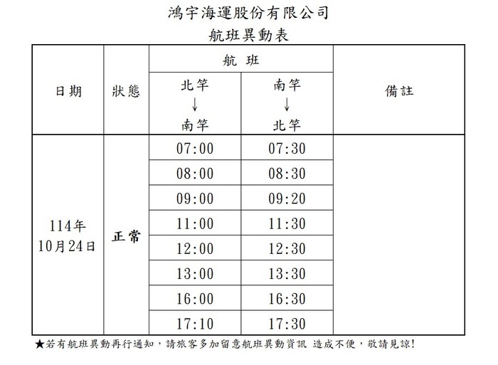 10/24【鴻宇海運】-南北竿航線【正常開航】 --閱讀人次 : 578