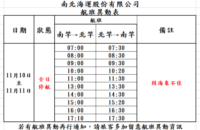 11/10-11/11【南北海運】-南北竿航線 【停航】 --閱讀人次 : 1101 本公司經營南竿往返北竿航線,因受強烈東北季風和颱風外圍影響,海象不佳