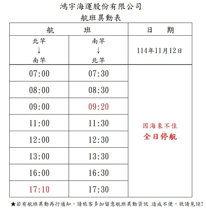 為旅客及航行安全,11月12日 全日停航,造成不便,敬請見諒,謝謝!