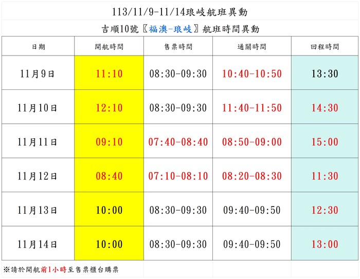 11/9-11/14【吉順10號】琅岐航班時間異動 ~更新