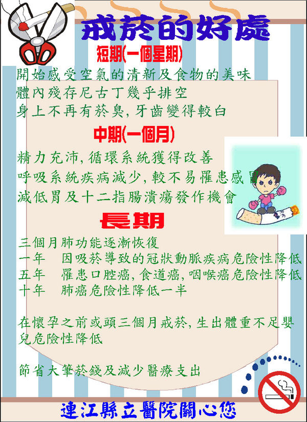 連江縣立醫院提供門診戒菸給民眾,歡迎民眾踴躍前來戒菸。