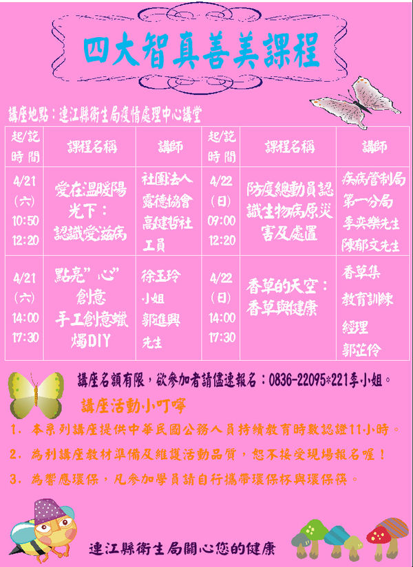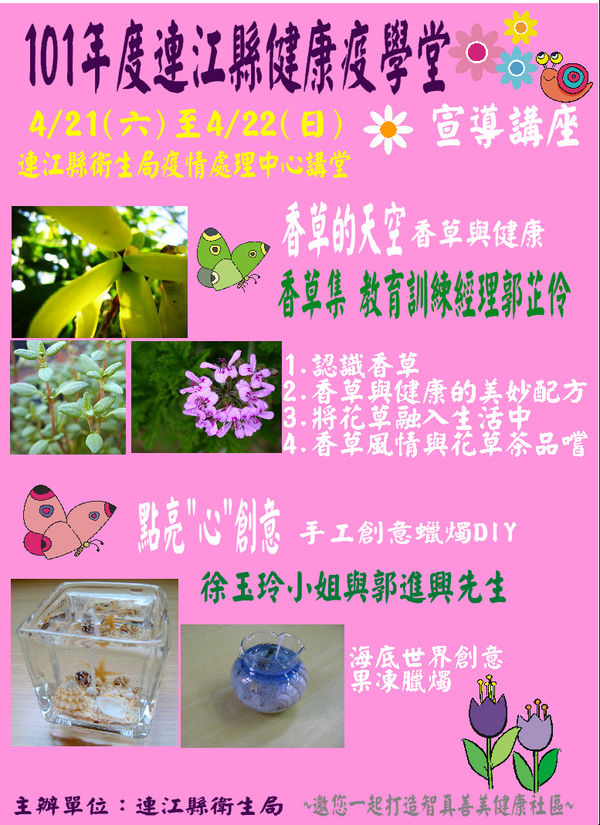 有果凍蠟燭與品味香草茶,還有創意結合防疫的愛滋病防治與生物病原災害防治與處置趣味結合精彩課程,等您加入健康疫學堂-智真善美的行列!