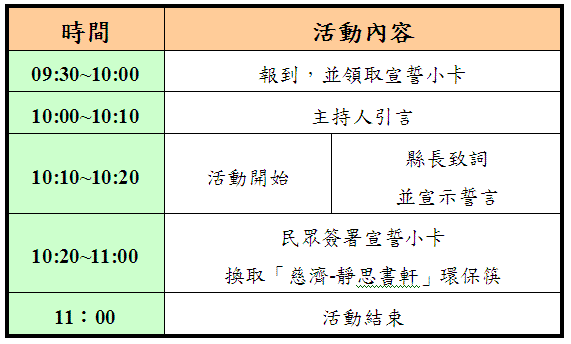 為配合2012年世界地球日(4/22)環保日,以及十億個綠行動的理念,教導民眾如何落實低碳於日常生活中,環保局將於4/22上午9:30在介壽澳口舉行宣誓大會,並發放慈濟-靜思書軒環保餐具及其他宣導品,數量有限,歡迎大家踴躍參加。