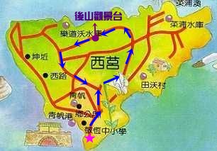 敬恆國中小(國小部操場) → 圓環 → 莒光醫院 → 後山觀景台(休息站) → 西坵活動中心 → 有容路 → 圓環 → 學校(國小部操場)。