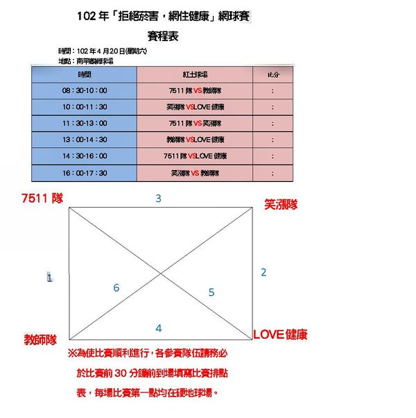 4/20「拒絕菸害,網住健康」網球賽賽程表