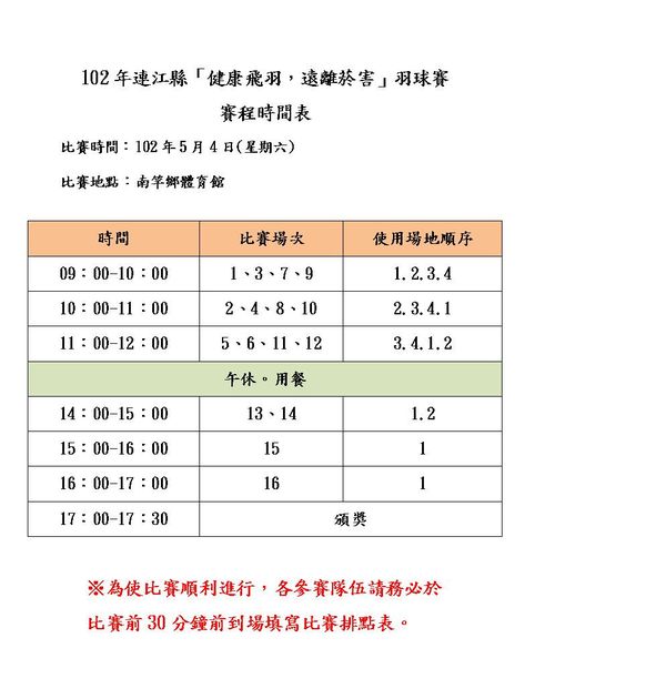 102年「健康飛羽•遠離菸害」賽程表