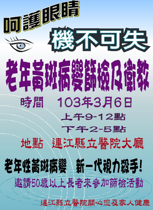 老年黃斑部病變雖然可怕,但早期發現早期治療,多數病患還是能維持良好視力,因此邀請50歲以上鄉親,3月6日上午或下午來本院大廳進行老年黃斑病變篩檢,提前發現、保護你我的視力健康。