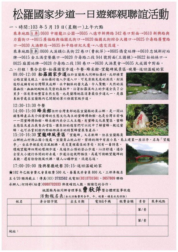松羅國家步道一日遊鄉親聯誼活動 --閱讀人次 : 1200 一、時間:103年5月19日(星期一)上午六點