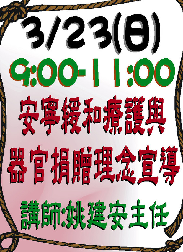 認識安寧緩和醫療與器官捐贈講座-邀請您 --閱讀人次 : 949 加強民眾對安寧緩和醫療與器官捐贈的瞭解及高齡者的善終,透過宣導促使民眾對生命有更正向的思考與想法,在面對家中親人臨終前的醫療選擇有新的思維,歡迎您及家人前來聆聽。