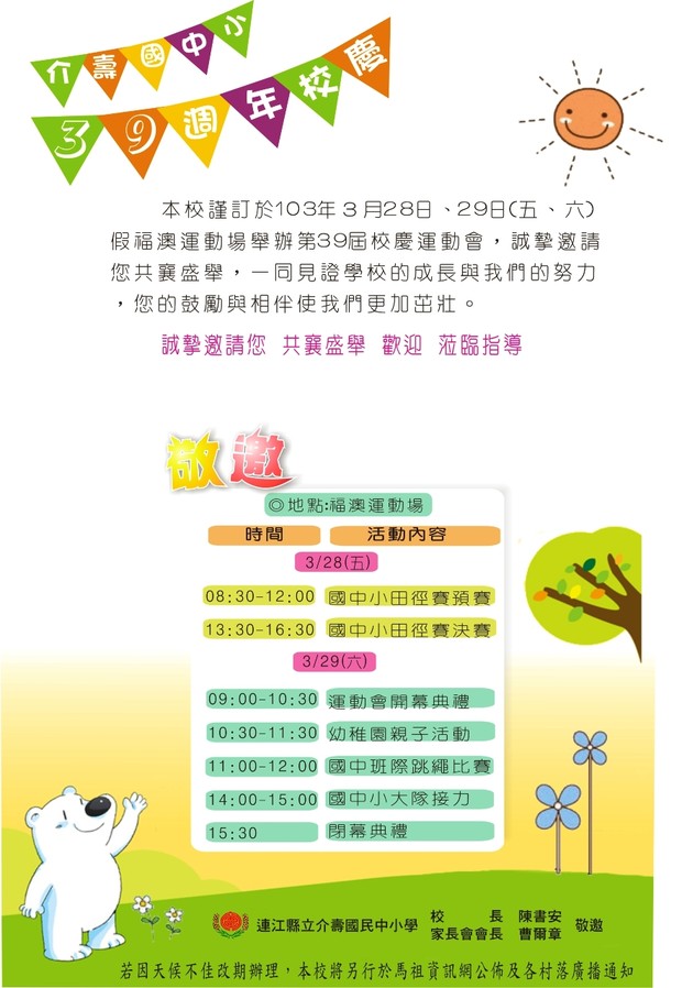 歡迎來參加3.28-29介壽校慶運動會 --閱讀人次 : 952 連江縣立介壽國民中小學慶祝103年青年節暨39週年校慶運動會