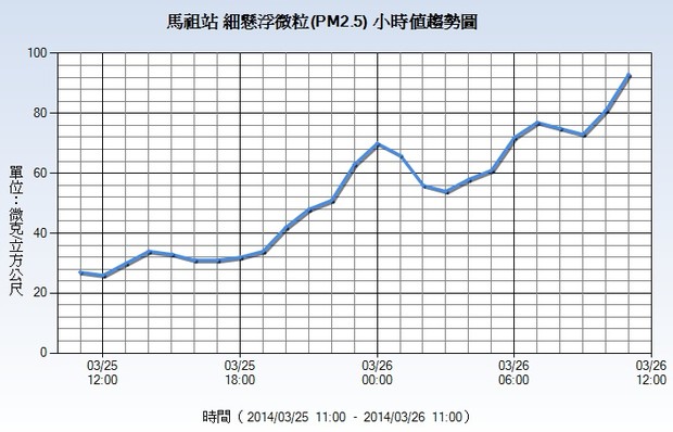 今天中午,馬祖地區空氣中的「細懸浮微粒(PM2.5)」已達93微克/立方公尺,而「懸浮微粒(PM10)」則也高達166微克/立方公尺。