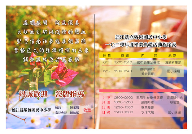 敬恆國民中小學謹訂於6月19日(四)舉行國中部第44屆,國小部第60屆,幼兒園第29屆畢業典禮,誠摯邀請您蒞臨參加~