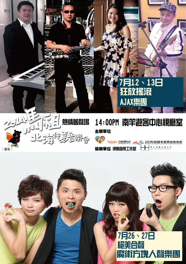2014北海仲夏音樂會熱情暖聲場 --閱讀人次 : 1181 馬祖國家風景區管理處將於103年7月12、13日及7月26、27日,下午14點於南竿遊客中心視聽室舉辦「2014北海仲夏音樂會熱情暖聲場」,7月12、13日首場邀請到由旅台鄉親「謝青峰」所領軍的Ajax樂團擔當演出,用最即性的搖滾遊客及鄉親同歡,7月26、27日首次邀請人體合聲「阿卡貝拉」團體「魔術方塊」到馬祖演出,不用樂器,只用人聲伴奏出和諧的樂響,是一場你絕對不能錯過的精采演出,敬請踴躍參加。