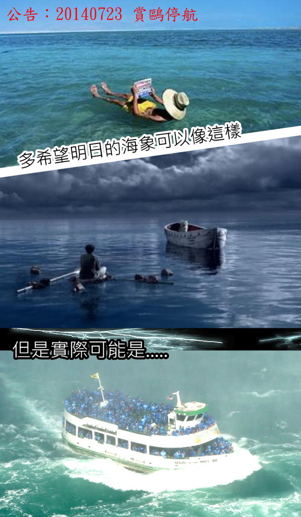 因受麥德姆MATMO颱風影響海象不佳,明日7/23生態賞鷗航班停航乙次,造成您的不便敬請見諒。