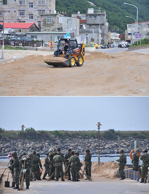 【記者陳鵬雄�北竿報導】災後復原,北竿鄉公所昨天協調北高守備大隊支援,進行塘后道積沙清除作業,機具加上近百人力一天搞定,道路恢復正常。