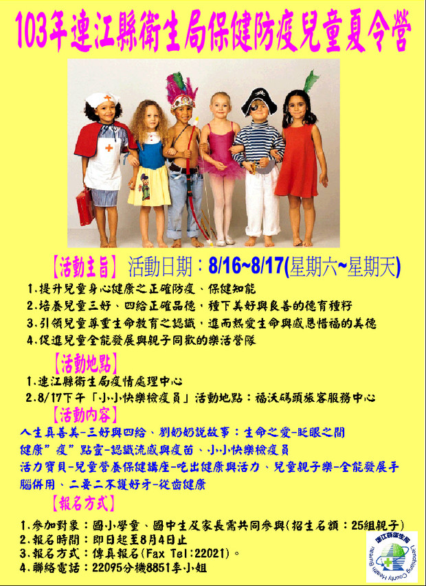 衛生局「防疫保健兒童夏令營」即日起開始招生(預計25組)。歡迎社區民眾及親子踴躍參加,共同為社區打造一個智真善美的幸福島嶼。然為珍惜資源故報名親子請勿任意缺席。「防疫保健兒童生命教育夏令營」諮詢專線:0836-22095分機8851李小姐