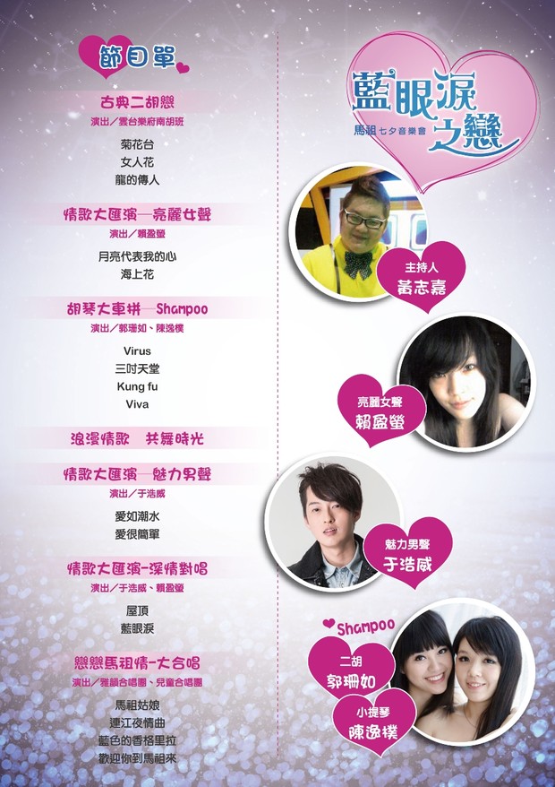 邀請入選「中國好聲音」的賴盈螢、「小張雨生」于浩威、「大學生了沒」固定班底黃志嘉Juicy以及中西合璧─二胡、小提琴女子團體「Shampoo」(郭珊如、陳逸樸)輪番上陣,另外,還有雲台樂府南胡班、雅韻合唱團、馬祖兒童合唱團等數十位表演者,要和馬祖的朋友們一起度過這個浪漫七夕。