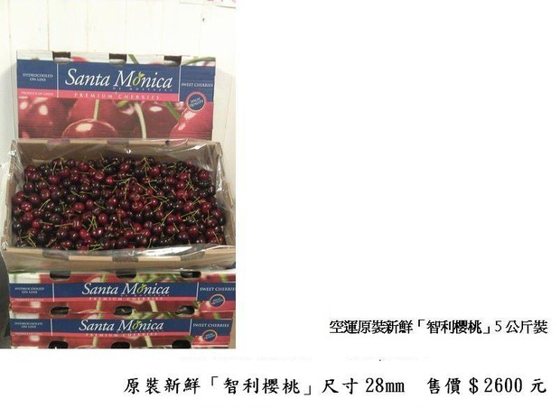 空運智利原裝新鮮櫻桃 原封箱 9.5row = 28mm (含箱重5公斤/8台斤) 售 2,600元