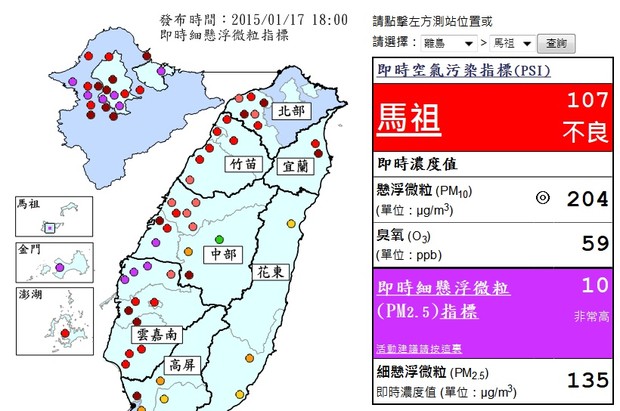 尤其馬祖地區今天下午6點細懸浮微粒(PM2.5)濃度達135,空污指標已超過10級,請停止戶外運動,維護您的健康。