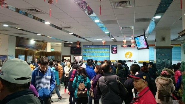 上午福澳候船大樓,曹雅慧攝。今天臺馬輪從南竿載走460人,東引33人,已達客滿,一百多人無床位,須「坐船」到台灣,今晚也將會有很多人「坐船」回馬祖,晚上無床位更辛苦!