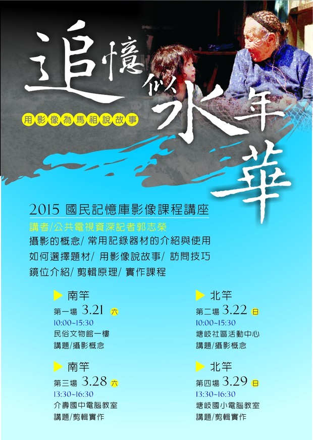 國民記憶庫影像紀錄課程將於3月21、22日(六、日)及3月28日、29日(六、日)兩個週末上課,共計招收南、北竿共兩場次,攝影概念:3月21日於南竿、3月22日於北竿;剪輯實作:3月28日於南竿、3月29日於北竿;歡迎對影像製作有興趣的朋友踴躍參加,用影像共同為馬祖寫故事。