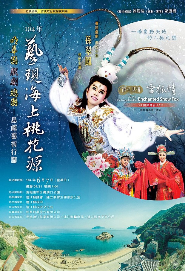 明華園6/7蒞馬演出「濟公活佛-雪狐情」 --閱讀人次 : 999 明華園將於6月7日(日)晚間7時於南竿介壽澳口公園演出「濟公活佛-雪狐情」,是齣浪漫唯美、驚動天地人狐之戀的故事,更值得期待的是該團「無敵小生」孫翠鳳將親自蒞馬主演,屆時歡迎旅客鄉親踴躍前往欣賞。