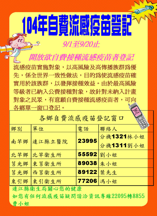 104年自費流感疫苗登記至9/20止