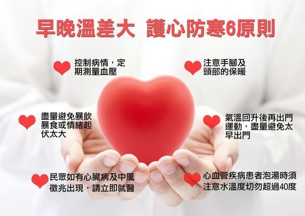 護心防寒,嚴防心血管疾病急性發作! --閱讀人次 : 2913 時序將進入冬天,近日氣溫驟降,早晚溫差大,低溫容易誘發心臟病、中風急性發作,呼籲鄉親一定要加強保暖,尤其長者、三高及心血管疾病患者要特別留意這種天氣的急遽變化,如果突然有胸悶、胸痛、呼吸困難等症狀,或是發生臉部表情不對稱、單手無力下垂、口齒不清的情形,一定要儘速就醫。