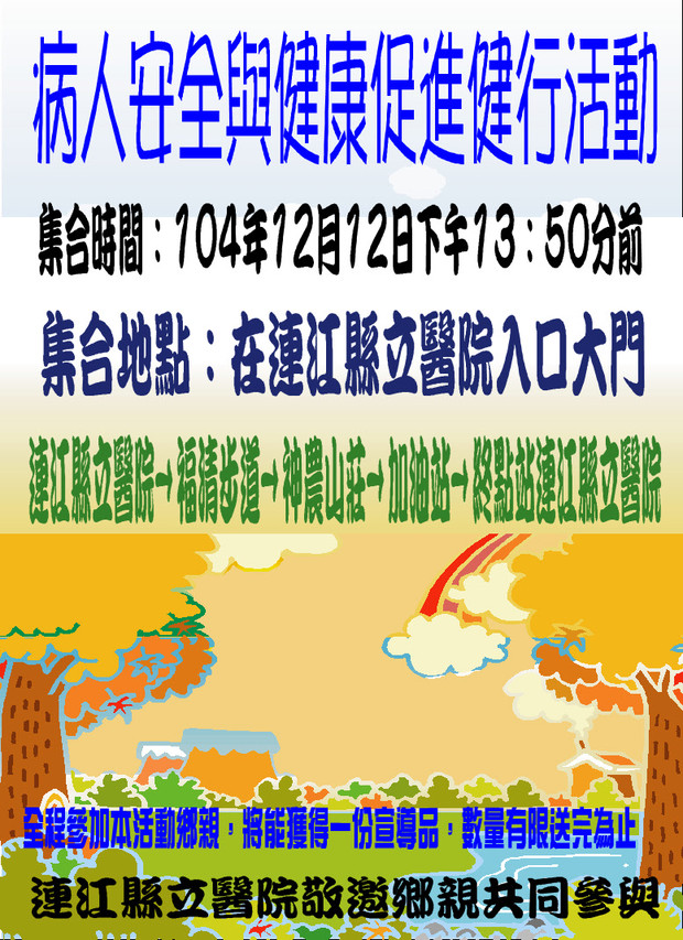 連江縣立醫院→福清步道→神農山莊→加油站→終點站連江縣立醫院,全程參加健走活動的民眾活動後將可獲得一份精美實用宣導禮品,請大家屆時呼朋引伴一起來參加。