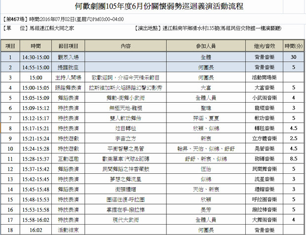 何歡劇團關懷社會巡迴義演,7/2文物館登場 --閱讀人次 : 610 何歡劇團將要在7月2日星期六下午三點在清水民俗文物館演藝廳表演囉!